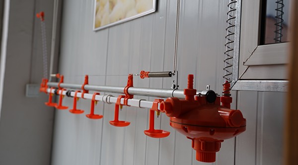 →饮水系统分为三个部分:供水系统、升降系统和防栖系统。 供水系统由减压阀组件、水表组件、过滤器组件、加药器组件、主水管道、分流器组件等组成。 减压阀组件:对进水压力进行调节,使进水压力在0.03-0.4MPa; 水表组件:方便对每栋鸡舍用水量进行统计,提供鸡只清洁用手;同时对进水压力进一步减压; 加药器组件:通过在加药器上对加药比例的调节,给水管内加入药物,提高鸡只免疫力; 升降系统的主要